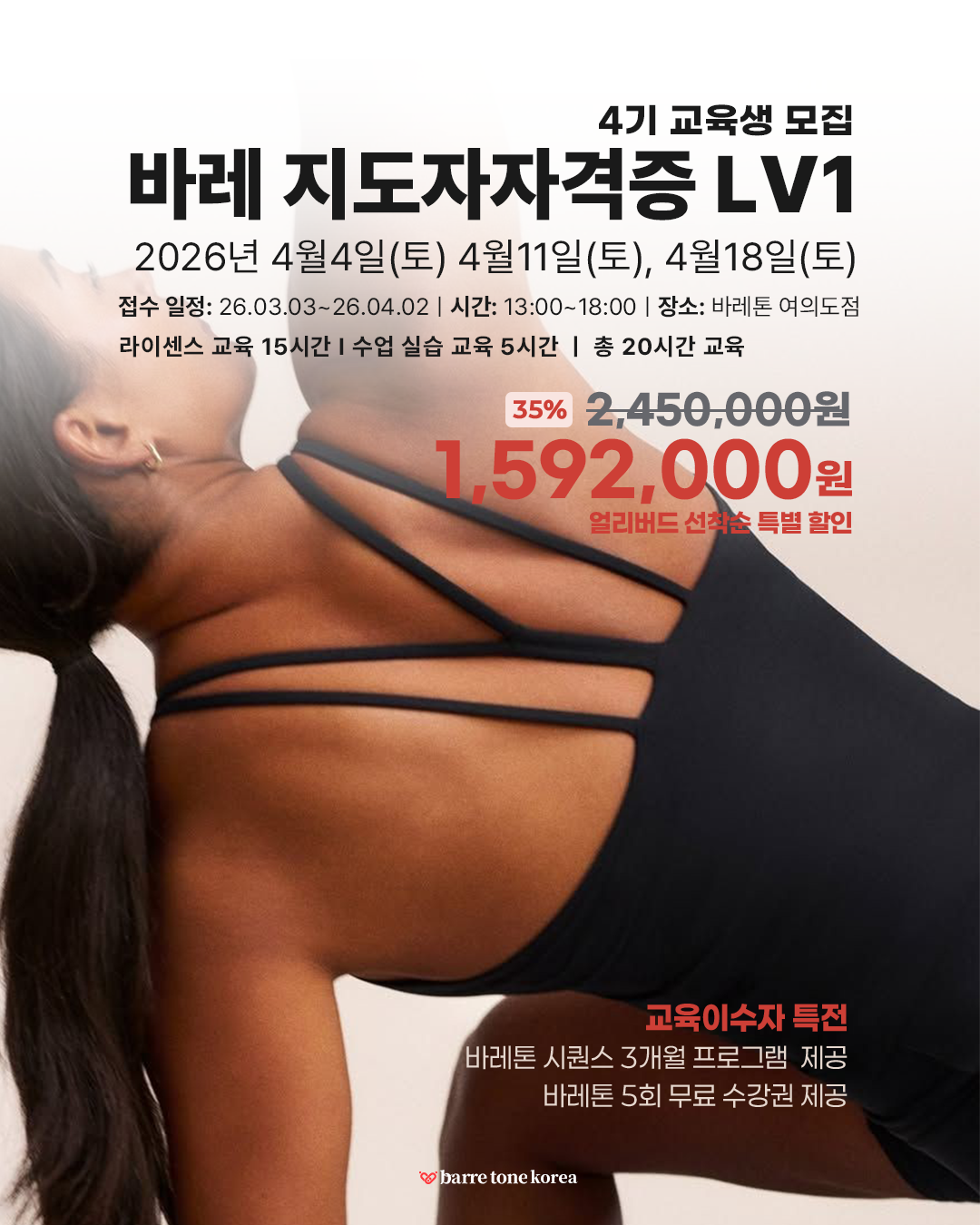 얼리버드 혜택 선착순 마감 35% 할인 + 바레톤 5회 무료체험권 제공하고 있습니다.
